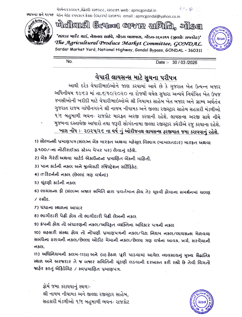 આથી દરેક વાહન માલિકો તથા ખેડૂત ભાઈઓને ખાસ જાણ કરવામાં આવે છે કે તારીખ 1/ 5 / 2024 ને બુધવાર થી વાહન એન્ટ્રી પાસ ફરજીયાત તથા તમામ માલ આવકોના ડિજિટલ ગેટ પાસ ફરજિયાત કઢાવવાના રહેશે.