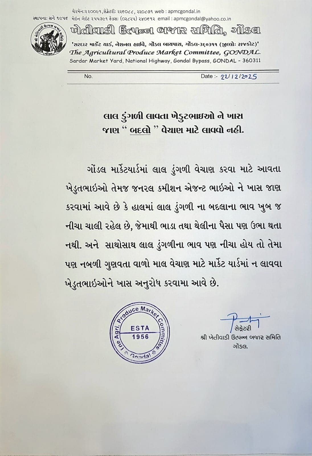 આથી દરેક વાહન માલિકો તથા ખેડૂત ભાઈઓને ખાસ જાણ કરવામાં આવે છે કે તારીખ 1/ 5 / 2024 ને બુધવાર થી વાહન એન્ટ્રી પાસ ફરજીયાત તથા તમામ માલ આવકોના ડિજિટલ ગેટ પાસ ફરજિયાત કઢાવવાના રહેશે.
