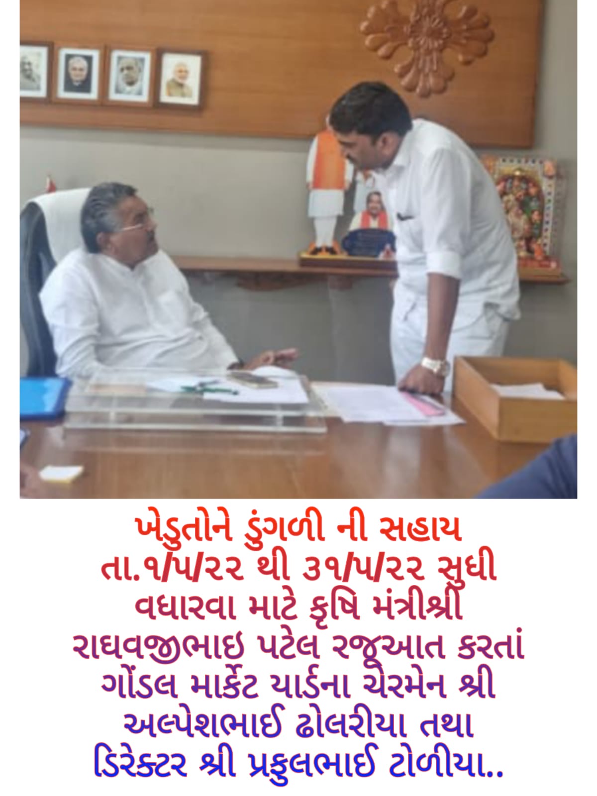 રાજ્યના માન. કૃષિમંત્રી શ્રી રાઘવજીભાઇ પટેલ સાહેબ ને ખેડુતોને ડુંગળી ના પોષણક્ષમ ભાવ સહીત વિવિધ મુદા