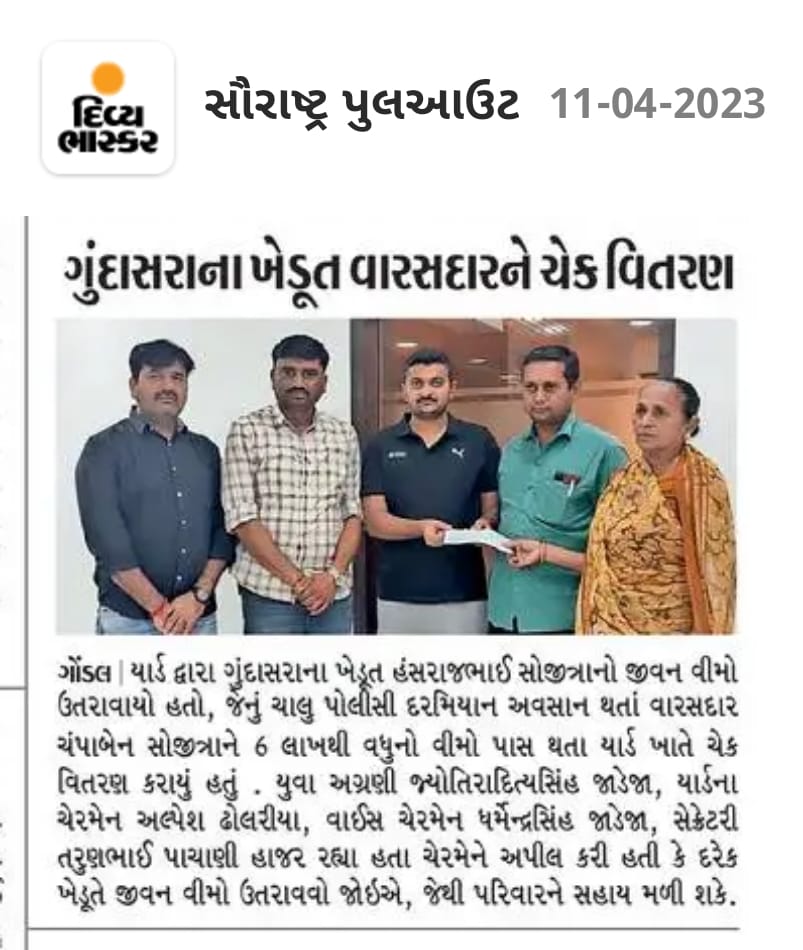 ગોંડલ માર્કેટ યાર્ડ દ્વારા ગોંડલ તાલુકાના ખેડુતો નો અકસ્માત મૃત્યું વળતળ માટે નો વીમો લેવા માં આવે છ