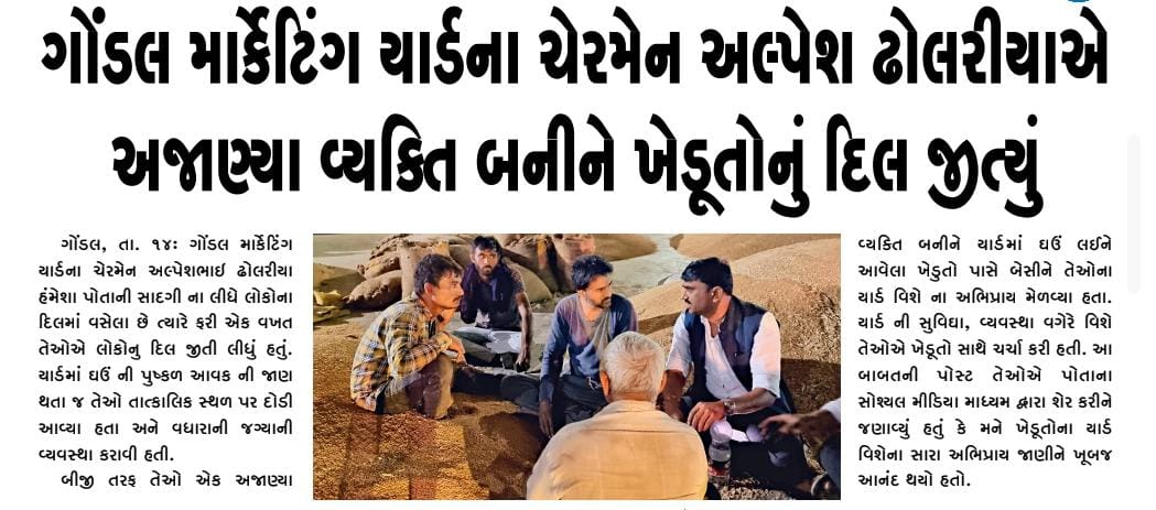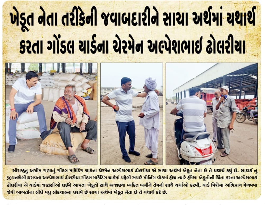 ખેડૂત નેતા તરીકે ની જવાબદારીને સાચા અર્થમા યથાથ્ર કરતાં ગોંડલ યાર્ડ ના ચેરમેન અલ્પેશભાઈ ઢોલરીયા