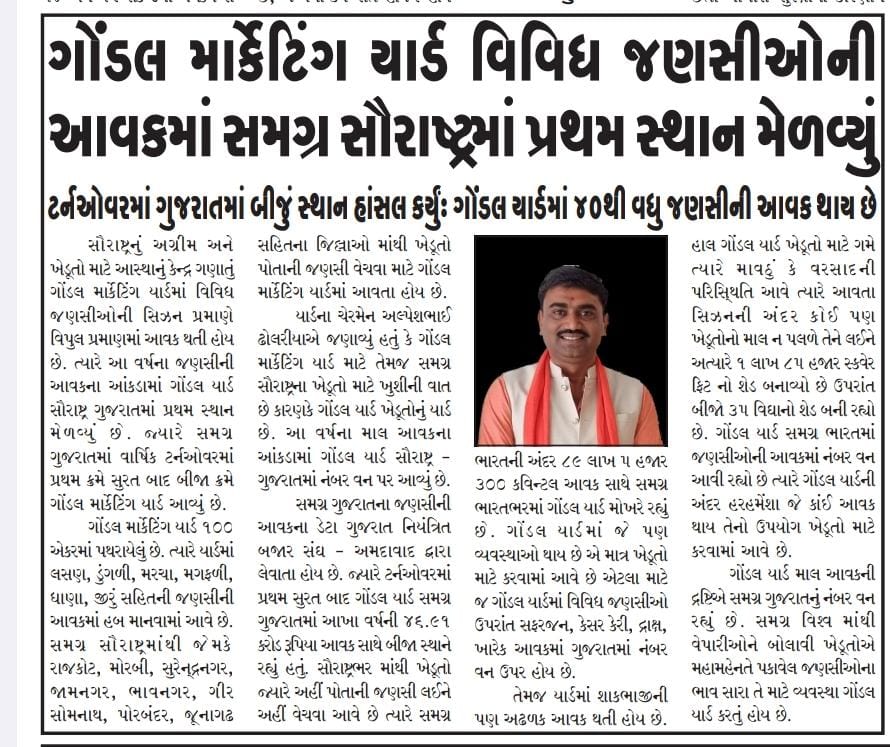 ગોંડલ માર્કેટિંગ યાર્ડ વિવિધ જણસીઓ ની આવક મા સમગ્ર સૌરાસ્ટ્ર મા પ્રથમ સ્થાન મેળવ્યું .